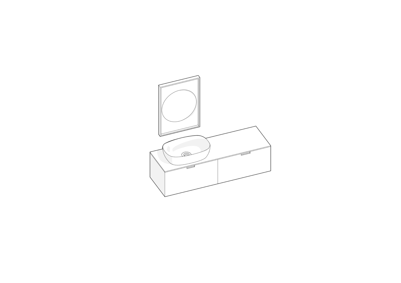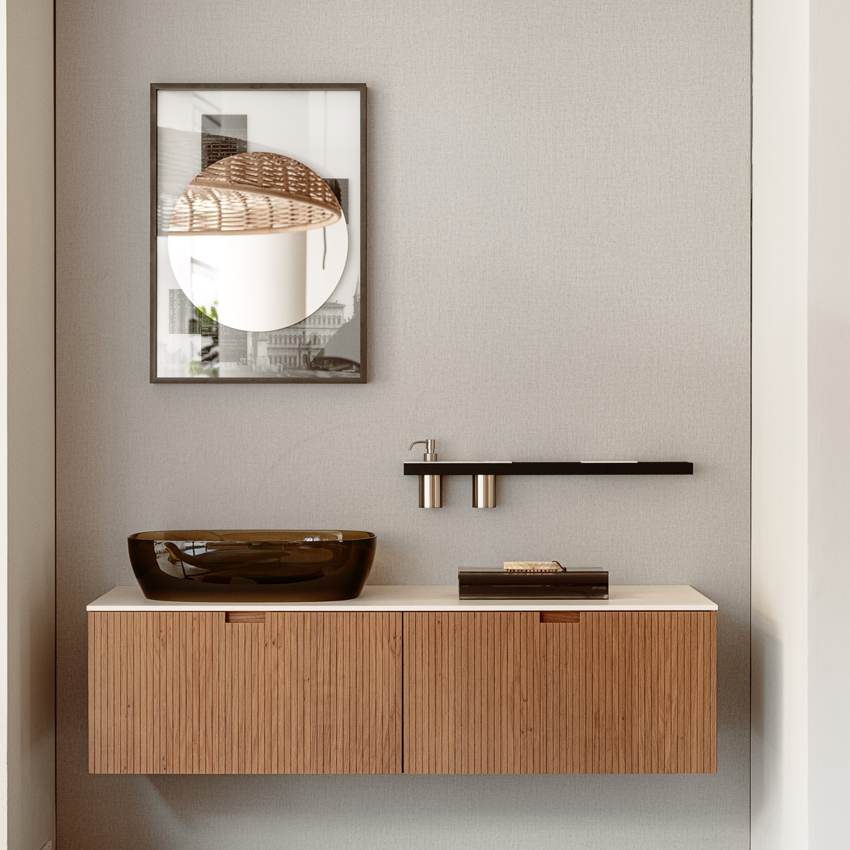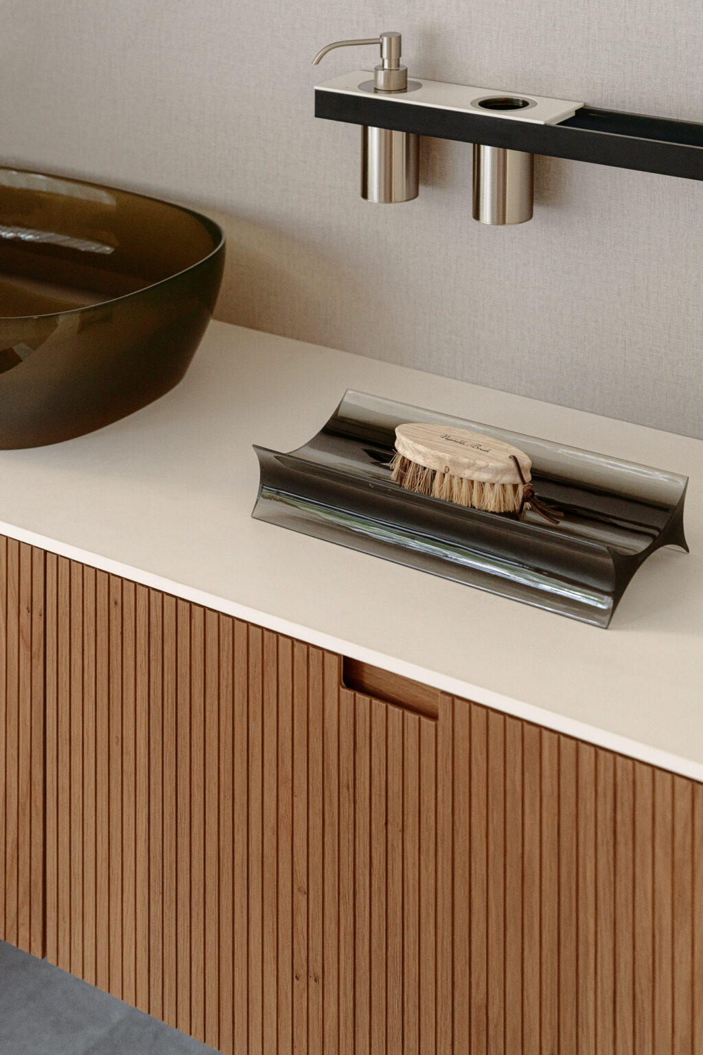 Binario – zabudowa umywalkowa o czystych liniach i eleganckiej prostocie, charakterystycznej dla stylu marki. Geometryczny rytm równoległych nacięć na frontach i bokach w wykończeniu Rovere Evaporato nadaje bryle trójwymiarowości i lekkości, tworząc subtelny efekt plisowania. Kompozycję dopełnia blat z Flumood Bianco oraz umywalka Senso w odcieniu Gran Ecru, uzupełniona korkiem w kolorze Graphite. Wnętrze kryje dodatkową szufladę, zapewniając perfekcyjną organizację przestrzeni. Zestaw można wzbogacić o akcesoria Antonio Lupi, takie jak lustro Collage, półka Tape z tacką Moodlight, dozownik do mydła i kubeczek w wykończeniu Satin Stainless Steel czy tacka X-Tray z Cristalmood. Zakup zestawu możliwy jest po osobistym obejrzeniu mebli, zapraszamy do kontaktu z naszymi doradcami.