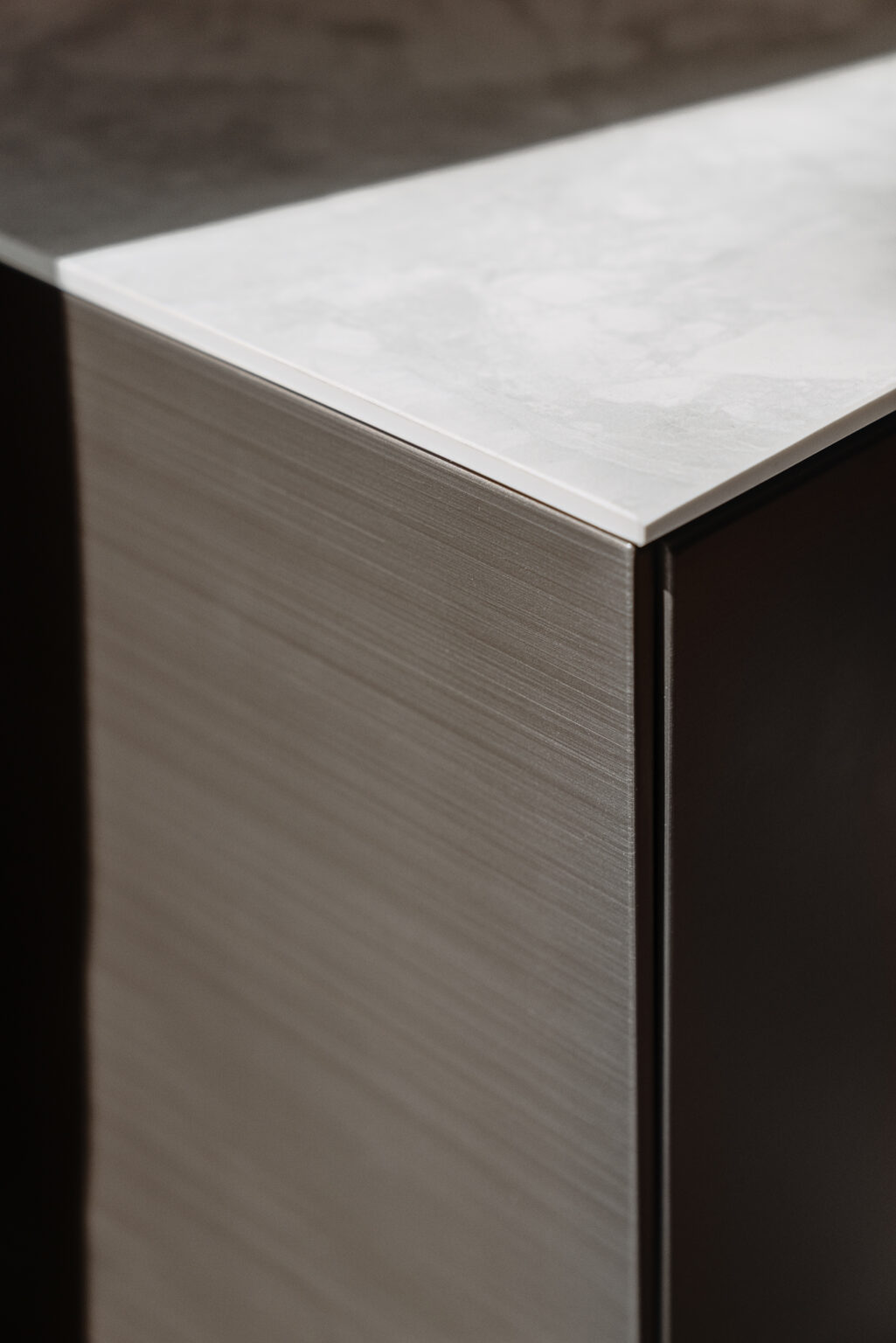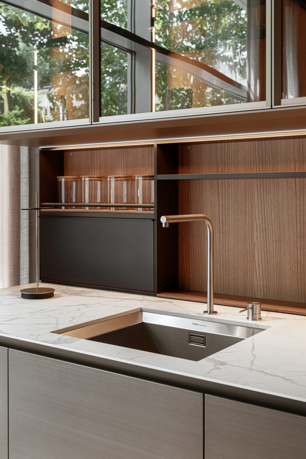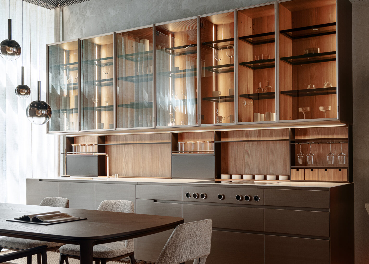 Poliform Phoenix to kuchnia, która łączy ponadczasowy design z pełną swobodą aranżacji. Charakterystyczny system otwierania bez uchwytów nadaje jej lekkości i nowoczesnego wyrazu, a jednocześnie zapewnia wygodę codziennego użytkowania. Kompozycję tworzy dolna zabudowa zintegrowana z wiszącymi witrynami oraz ciąg wysokich szaf. Dolne szafki utrzymane są w matowym, eleganckim wykończeniu, a ich minimalistyczny charakter podkreślają subtelne detale, takie jak pokrętła sterujące płytą grzewczą. Witryny z przyciemnianego szkła wykończono od wewnątrz fornirem. Zintegrowane oświetlenie wprowadza lekkość i wyrafinowanie, jednocześnie eksponując przechowywane przedmioty. Ceramiczny blat mieści zarówno zlew, jak i płytę grzewczą z wyciągiem, tworząc funkcjonalne centrum pracy. Całość uzupełniają wysokie szafy, które zapewniają przestrzeń do przechowywania i porządkują zabudowę. W cenie kuchni dedykowany jest komplet sprzętu agd o szczegóły zapytaj doradcę. Zakup kuchni możliwy jest po osobistym obejrzeniu mebli, zapraszamy do kontaktu z naszymi doradcami.