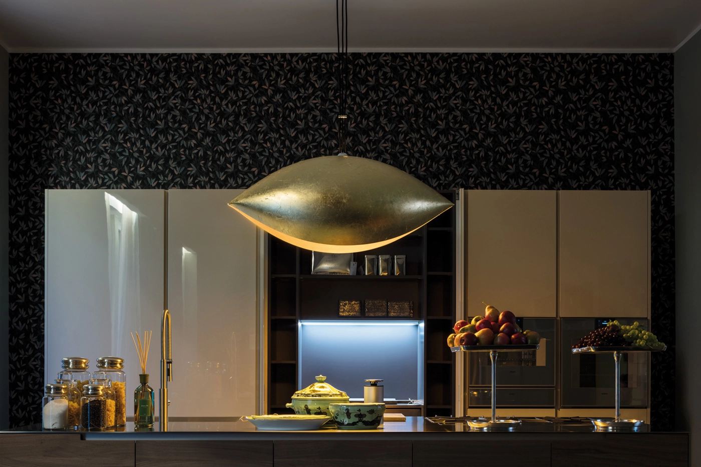 Wnętrze, w którym światło staje się głównym bohaterem, potrzebuje oprawy o wyjątkowej aurze. Z tej idei narodziła się Malagola: lampa, która łączy teatralną ekspresję z rękodzielniczą precyzją. Jej złota powierzchnia przywołuje ciepło słońca i ognia, a forma oparta na grze refleksów