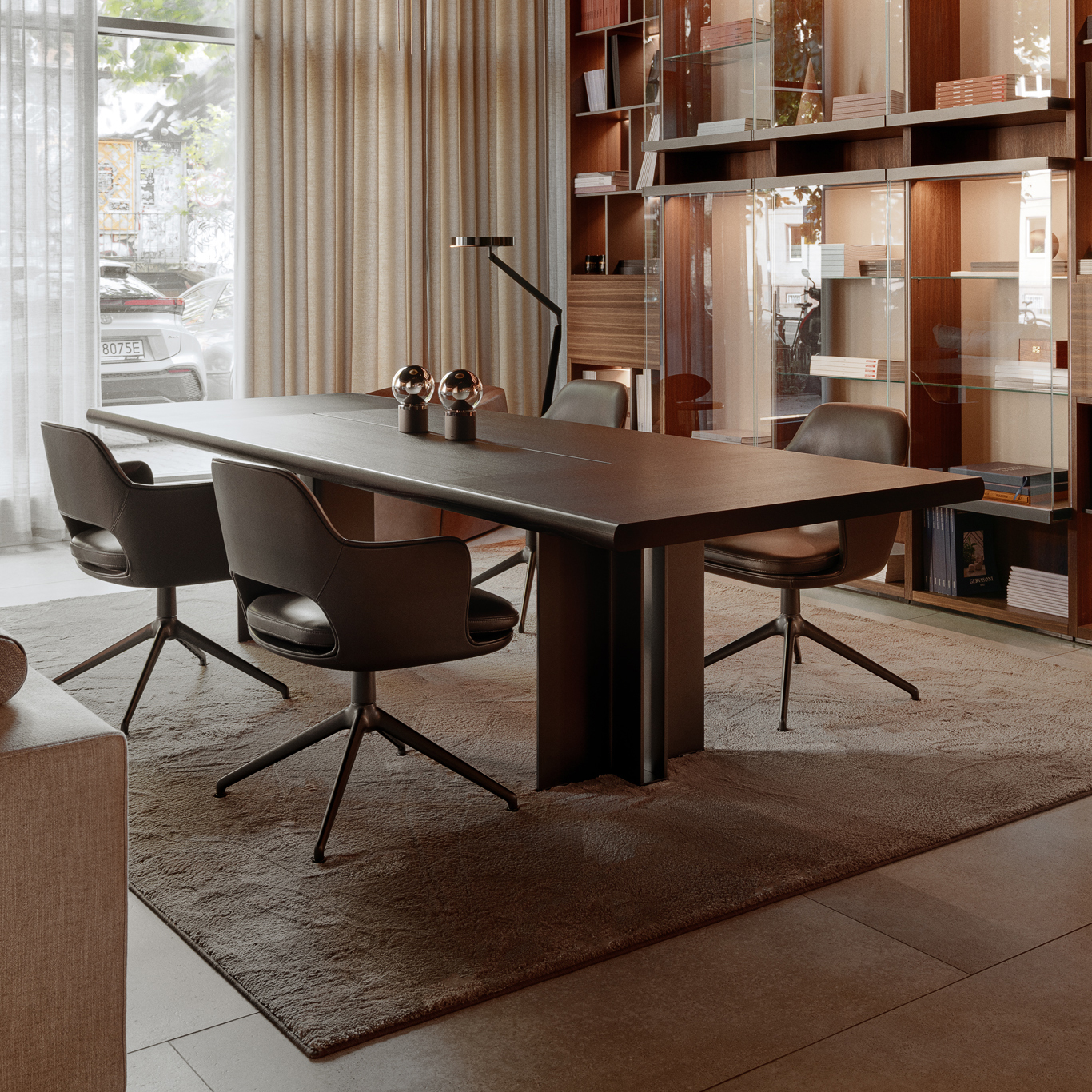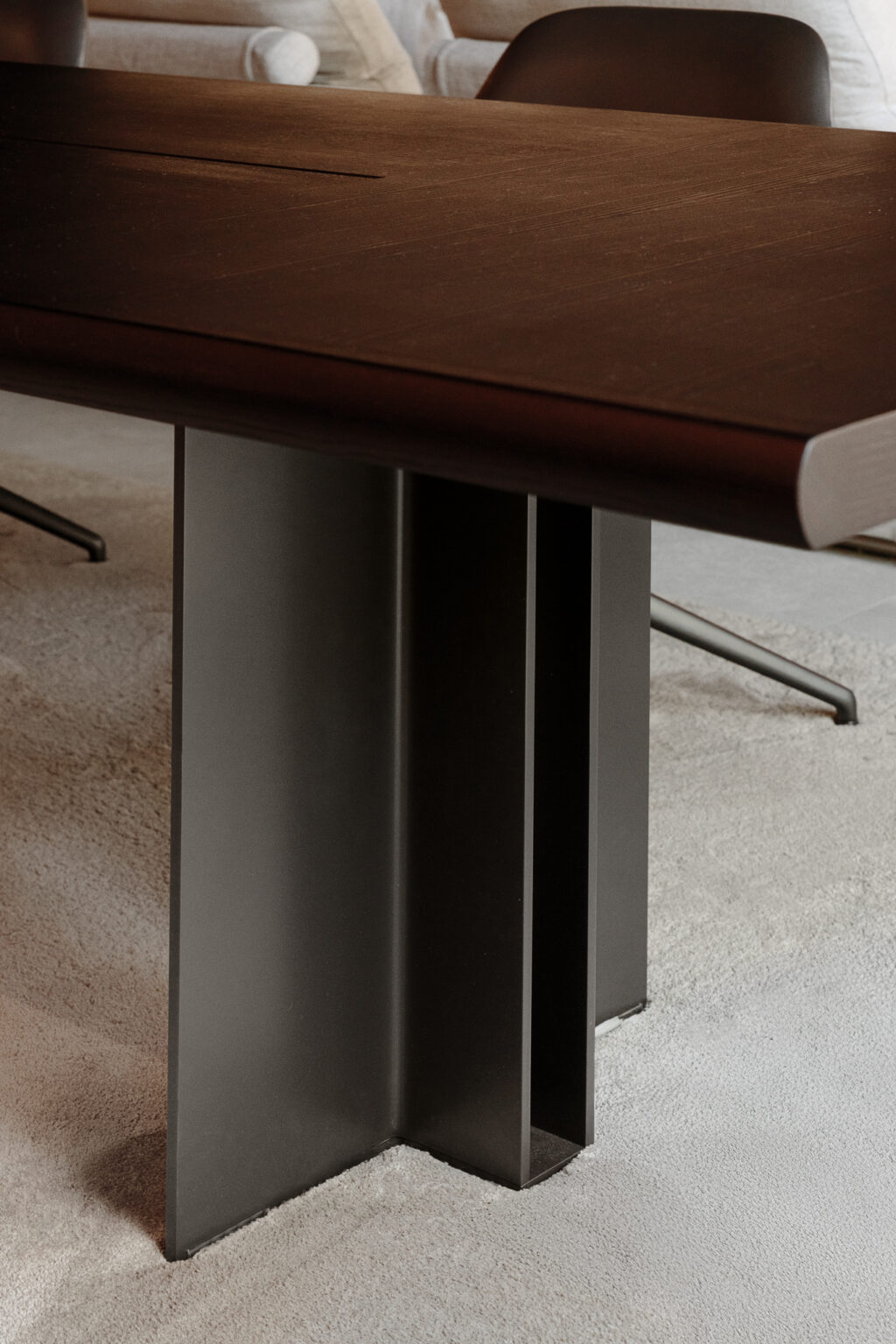 Stół Spello wyróżnia się rzeźbiarską formą inspirowaną brutalizmem – masywne metalowe bazy kontrastują tu z poetyckim pięknem blatu z litego drewna. Subtelne detale, takie jak układ desek nawiązujący do tradycji intarsji, czy delikatne rozcięcie biegnące przez całą długość, podkreślają wyrafinowany charakter projektu. Zakup stołu możliwy jest po osobistym obejrzeniu mebla, zapraszamy do kontaktu z naszymi doradcami.